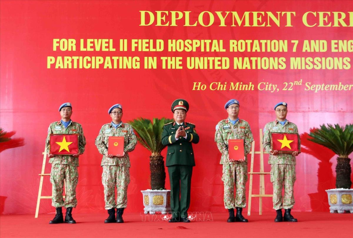 TP Hồ Chí Minh (TTXVN 22/9/2025) Sáng 22/9, tại Sân bay quốc tế Tân Sơn Nhất (Thành phố Hồ Chí Minh) và điểm cầu trực tuyến ở Hội trường Cục Gìn giữ hòa bình Việt Nam (Hà Nội), Bộ Quốc phòng tổ chức Lễ xuất quân Bệnh viện dã chiến cấp 2 số 7 và Đội Công binh số 4 lên đường thực hiện nhiệm vụ tại Phái bộ Gìn giữ hòa bình Liên hợp quốc ở Nam Sudan (UNMISS) và khu vực Abyei (UNISFA).