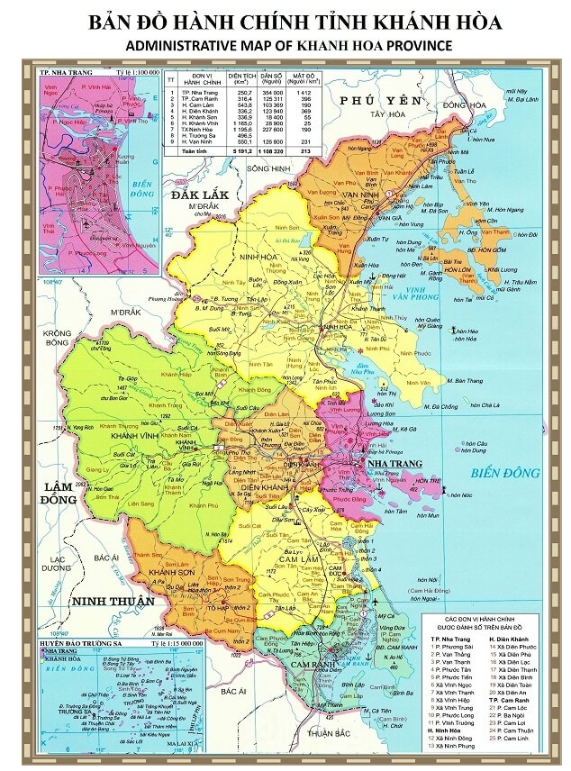 Về tổ chức hành chính hiện nay, tỉnh Khánh Hòa có 2 thành phố là Nha Trang, Cam Ranh, 1 thị xã Ninh Hòa và 6 huyện: Diên Khánh, Khánh Vĩnh, Khánh Sơn, Cam Lâm, Vạn Ninh và huyện đảo Trường Sa.