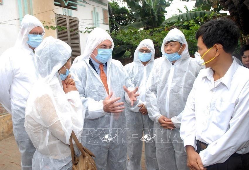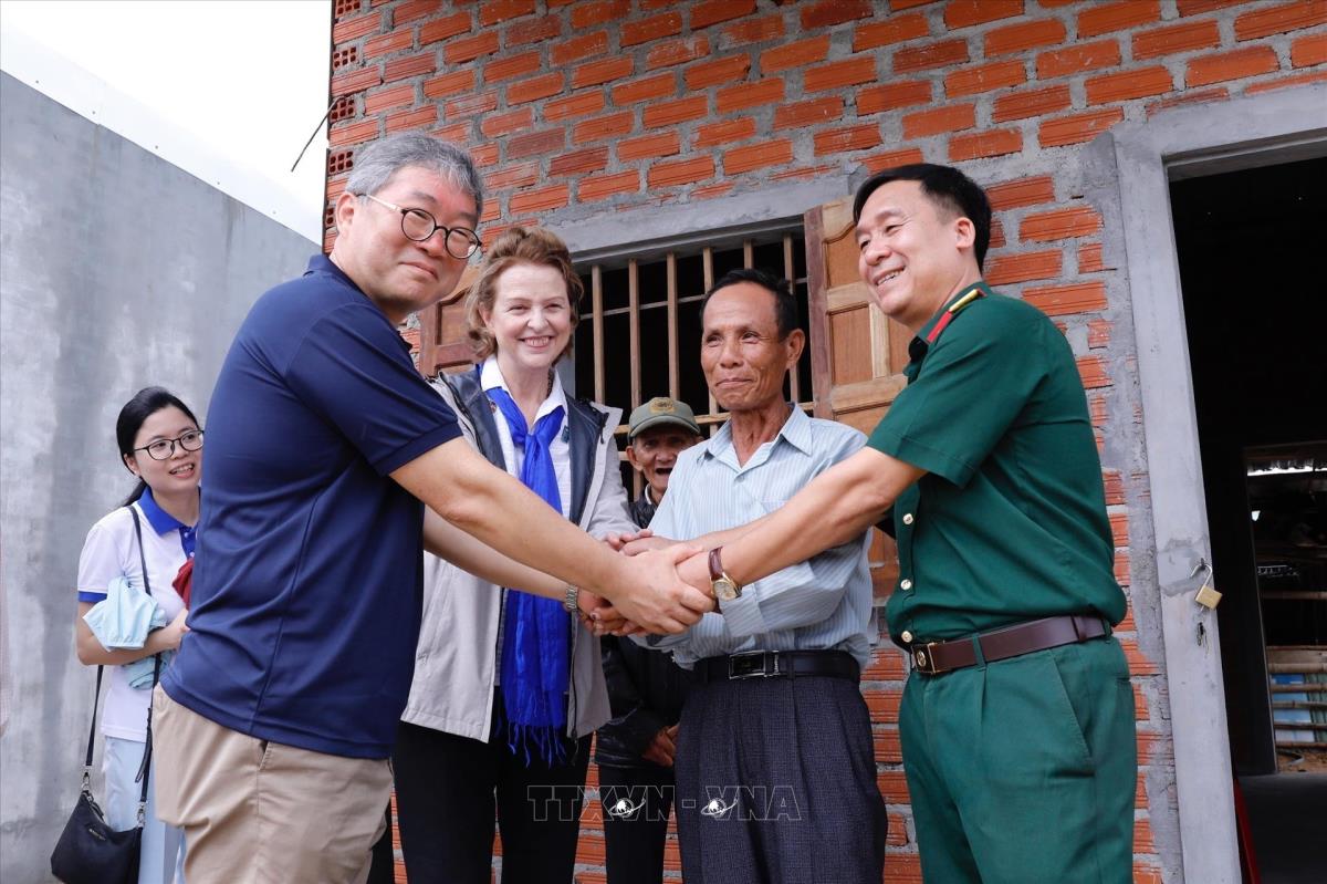 Đại diện Trung tâm Hành động bom mìn quốc gia Việt Nam (VNMAC) cùng bà Caitlin Wiesen, Đại diện thường trú Chương trình phát triển Liên hợp quốc tại Việt Nam (UNDP) tại Việt Nam và ông Cho Han Deog, Giám đốc Cơ quan hợp tác quốc tế Hàn Quốc tại Việt Nam (KOICA Vietnam) thăm người dân ở khu vực đã xử lý bom mìn, vật nổ tại xã Cát Nhơn, huyện Phù Cát, Bình ĐỊnh (20/10/2020). Ảnh: Dương Giang - TTXVN