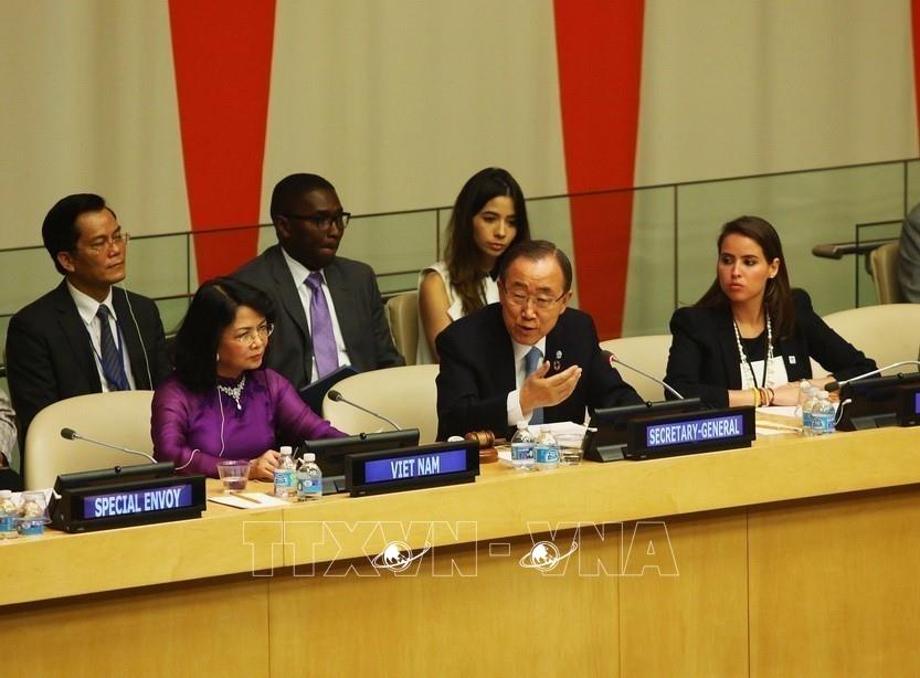 Phó Chủ tịch nước Đặng Thị Ngọc Thịnh dự và phát biểu tại Cuộc họp cấp cao về ứng phó với những tác động của El Nino và giảm thiểu rủi ro thường xuyên của biến đổi khí hậu do Văn phòng Điều phối các vấn đề nhân đạo của Liên hợp quốc (OCHA) tổ chức (New York, 2016). Ảnh: Lâm Khánh –TTXVN