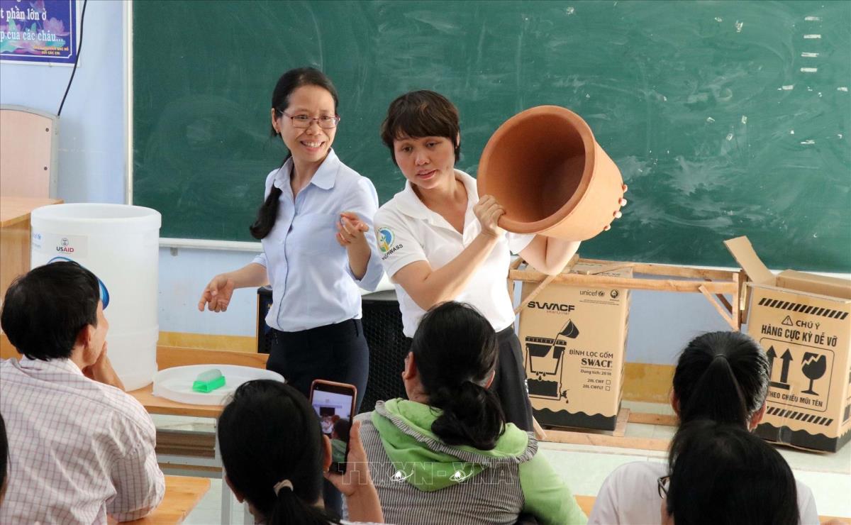 Đại diện Trung tâm Quốc gia Nước sạch và vệ sinh môi trường nông thôn hướng dẫn các trường học tại Ninh Thuận cách lắp ráp, sử dụng bình lọc nước bằng gốm do Quỹ Nhi đồng Liên Hiệp Quốc (UNICEF) tại Việt Nam hỗ trợ (2020). Ảnh: Công Thử - TTXVN