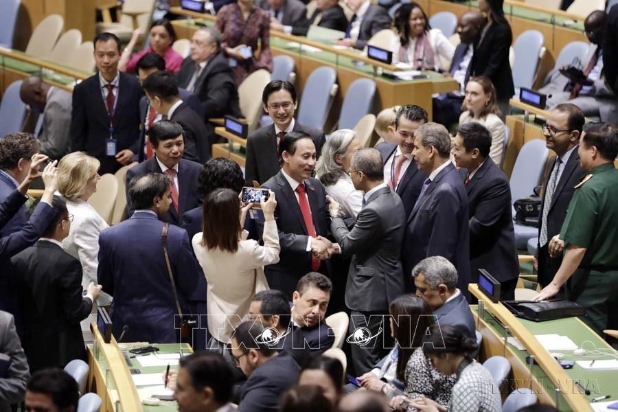 Trưởng đoàn Việt Nam, Thứ trưởng Bộ Ngoại giao Lê Hoài Trung (giữa trái) nhận lời chúc mừng của đại diện ngoại giao các nước sau khi kết quả bỏ phiếu cho thấy Việt Nam được bầu chọn là ủy viên không thường trực HĐBA LHQ nhiệm kỳ 2020-2021, tại New York, Mỹ ngày 7/6/2019. Ảnh: THX/TTXVN