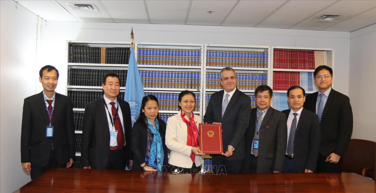Việt Nam có nhiều đóng góp tích cực, chủ động trong lĩnh vực giải trừ quân bị và chống phổ biến, nhất là giải trừ vũ khí hạt nhân và các loại vũ khí huỷ diệt hàng loạt khác. Trong ảnh: Ngày 17/5/2018, tại New York (Mỹ), Đại sứ Nguyễn Phương Nga, Trưởng Phái đoàn đại diện thường trực Việt Nam tại LHQ trao thư phê chuẩn Hiệp định cấm Vũ khí hạt nhân cho đại diện Ban thư ký LHQ. Ảnh: Nguyễn Hữu Hoàng - TTXVN