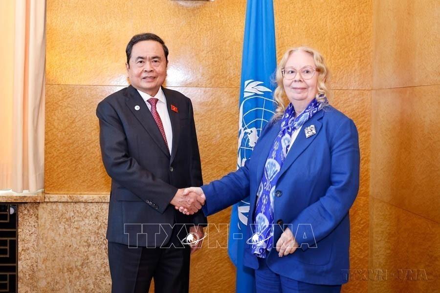 Trong khuôn khổ chương trình tham dự Hội nghị các Chủ tịch Quốc hội thế giới lần thứ 6 và tiến hành các hoạt động song phương tại Thụy Sĩ, chiều 29/7/2025 (giờ địa phương), tại Trụ sở Văn phòng Liên hợp quốc ở thành phố Geneva, Chủ tịch Quốc hội Trần Thanh Mẫn gặp bà Tatiana Valovaya, Tổng Giám đốc Văn phòng Liên hợp quốc tại Geneva (UNOG). Ảnh: Doãn Tấn – TTXVN