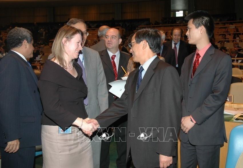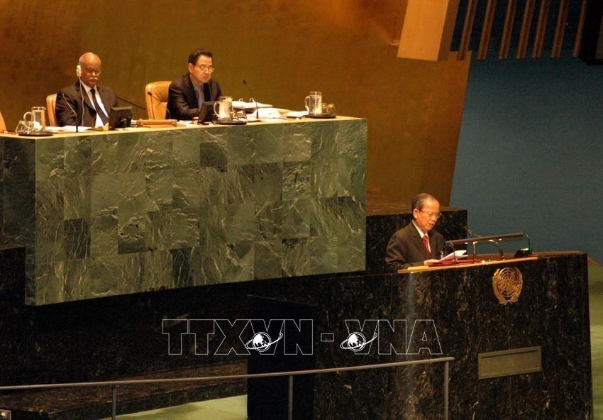 Kể từ khi gia nhập LHQ, Việt Nam đã tham gia ngày càng sâu, đảm nhận những cương vị quan trọng trong hệ thống LHQ và tích cực hoạt động trên cả ba trụ cột của LHQ. Trong ảnh: Chủ tịch nước Trần Đức Lương phát biểu tại lễ khai mạc Hội nghị cấp cao Thiên nhiên kỷ của Liên hợp quốc (New York, 6/9/2000). Ảnh: Trọng Nghiệp - TTXVN