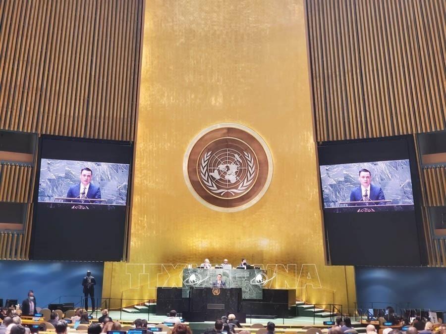 Ngày 1/3/2022, tại phiên họp đặc biệt khẩn cấp lần thứ 11 của Đại hội đồng Liên Hợp Quốc (LQH), Đại sứ, Trưởng Phái đoàn thường trực Việt Nam tại LHQ Đặng Hoàng Giang đã kêu gọi các bên liên quan giảm leo thang căng thẳng, nối lại đối thoại và đàm phán thông qua tất cả các kênh, nhằm đạt được giải pháp lâu dài có tính đến lợi ích và quan ngại của tất cả các bên, trên cơ sở luật pháp quốc tế. Ảnh: Khắc Hiếu-TTXVN