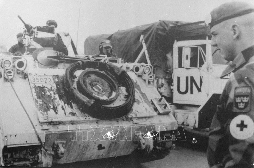Liên hợp quốc là tổ chức có sự hiện diện phủ khắp toàn cầu và hoạt động ở cả những địa bàn khó khăn nhất. Trong ảnh: Một đội quân của Thụy Điển thuộc Lực lượng gìn giữ hòa bình của Liên hơp quốc tiếp quản vị trí và nhiệm vụ của binh sĩ Canada tại vùng biên giới Macedonia và Serbia. Ảnh: Tư liệu/ TTXVN phát