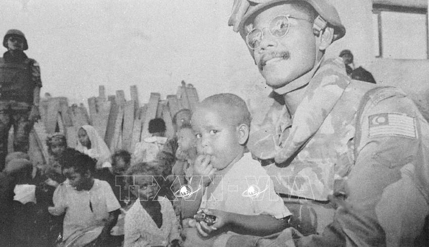 Liên hợp quốc là tổ chức có sự hiện diện phủ khắp toàn cầu và hoạt động ở cả những địa bàn khó khăn nhất. Trong ảnh: Những người lính Malaysia thuộc lực lượng gìn giữ hòa bình của Liên hợp quốc chăm sóc trẻ em tại một trại trẻ mồ côi ở phía Bắc Mogadisu (Somalia), ngày 16/11/1993. Ảnh: Tư liệu/TTXVN phát