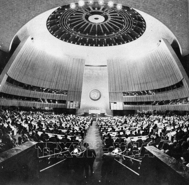 Sự ra đời của Liên hợp quốc năm 1945 phản ánh khát vọng chung của nhân dân các nước về một thế giới hòa bình, an ninh và phát triển sau những nỗi kinh hoàng của Chiến tranh thế giới thứ hai. Trong ảnh: Phiên họp toàn thể lần thứ 32 của Đại hội đồng Liên hợp quốc, ngày 20/9/1977. Ảnh: Tư liệu TTXVN