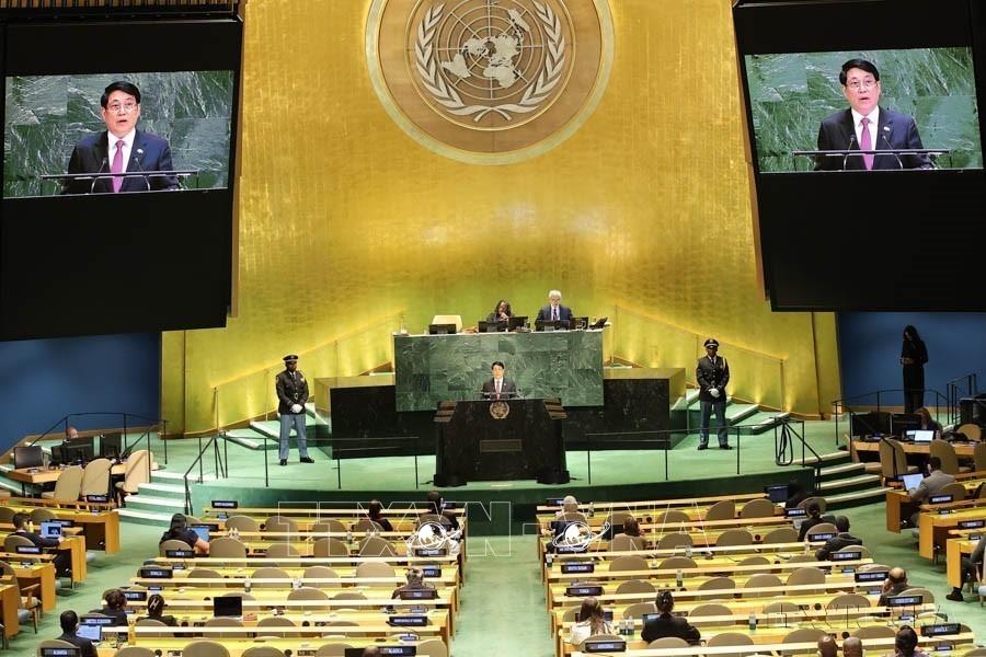 Chủ tịch nước Lương Cường phát biểu tại Phiên Thảo luận chung cấp cao Đại hội đồng Liên hợp quốc Khoá 80, tại Trụ sở Liên hợp quốc ở thành phố New York (Hoa Kỳ, 23/9/2025). Ảnh: Lâm Khánh – TTXVN