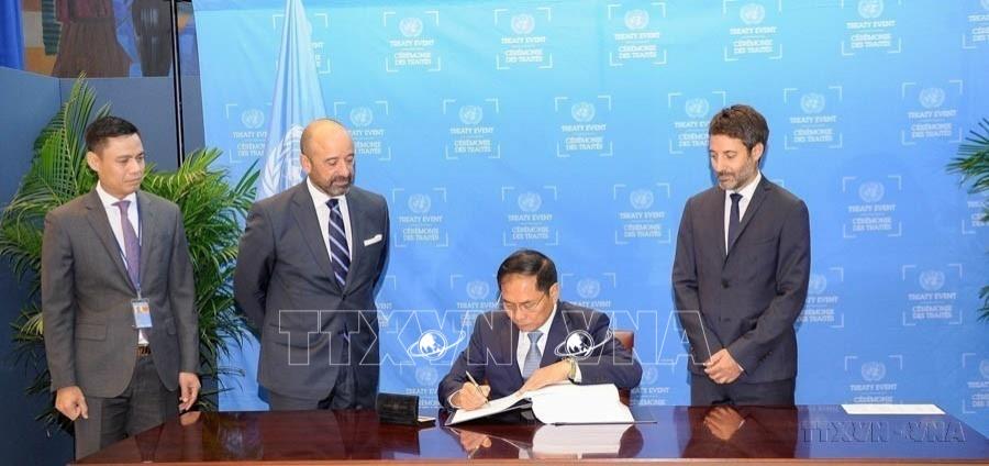 Trong khuôn khổ hoạt động của Tuần lễ cấp cao Đại hội đồng Liên hợp quốc khóa 78, Bộ trưởng Ngoại giao Bùi Thanh Sơn đã ký Hiệp định về Bảo tồn và sử dụng bền vững đa dạng sinh học ở vùng biển nằm ngoài quyền tài phán quốc gia, còn gọi là Hiệp định về Biển cả (2023). Ảnh: Quang Huy - TTXVN
