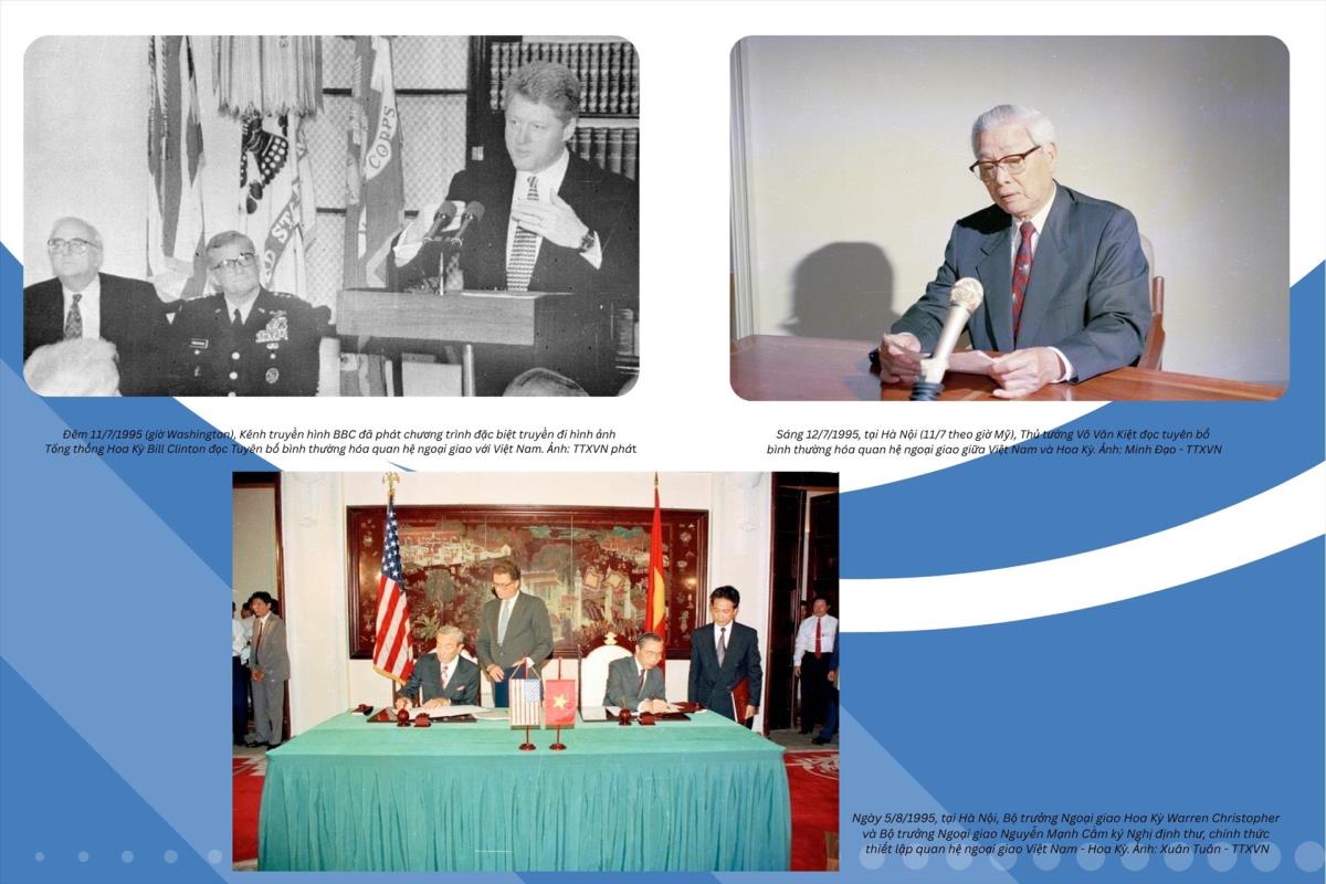 Sau một quá trình đàm phán và nỗ lực kéo dài từ cả hai phía, ngày 11/7/1995, Tổng thống Hoa Kỳ Bill Clinton tuyên bố chính thức bình thường hóa quan hệ ngoại giao với Việt Nam. Ngay sau đó, vào rạng sáng 12/7 (giờ Việt Nam), Thủ tướng Võ Văn Kiệt cũng chính thức thông báo quyết định tương tự từ phía Việt Nam.