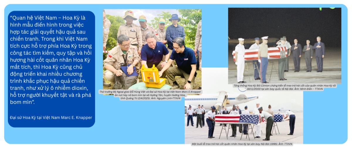 Đại sứ Hoa Kỳ tại Việt Nam Marc E. Knapper nhận định, quan hệ Việt Nam - Hoa Kỳ là hình mẫu điển hình trong việc hợp tác giải quyết hậu quả sau chiến tranh. Trong khi Việt Nam tích cực hỗ trợ phía Hoa Kỳ trong công tác tìm kiếm, quy tập và hồi hương hài cốt quân nhân Hoa Kỳ mất tích, thì Hoa Kỳ cũng chủ động triển khai nhiều chương trình khắc phục hậu quả chiến tranh, như xử lý ô nhiễm dioxin, hỗ trợ người khuyết tật và rà phá bom mìn.