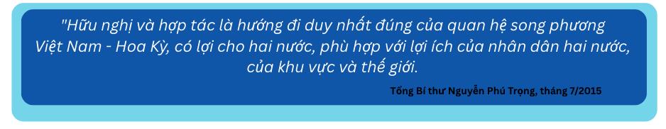 Trong cuộc hội đàm với Tổng thống Hoa Kỳ Barack Obama tại Nhà Trắng tháng 7/2015, Tổng Bí thư Nguyễn Phú Trọng nhấn mạnh: "Hữu nghị và hợp tác là hướng đi duy nhất đúng của quan hệ song phương Việt Nam - Hoa Kỳ, có lợi cho hai nước, phù hợp với lợi ích của nhân dân hai nước, của khu vực và thế giới. Trong một thế giới đang thay đổi nhanh chóng hiện nay, lợi ích tương đồng giữa hai nước càng được mở rộng, quan hệ Việt Nam - Hoa Kỳ trong thời gian tới cần hướng tới mục tiêu phát triển ngày càng sâu rộng, thực chất và hiệu quả".