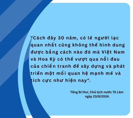 "Cách đây 30 năm, có lẽ người lạc quan nhất cũng không thể hình dung được bằng cách nào đó mà Việt Nam và Hoa Kỳ có thể vượt qua nỗi đau của chiến tranh để xây dựng và phát triển một mối quan hệ mạnh mẽ và tích cực như hiện nay", Tổng Bí thư, Chủ tịch nước Tô Lâm phát biểu ngày 23/9/2024.
