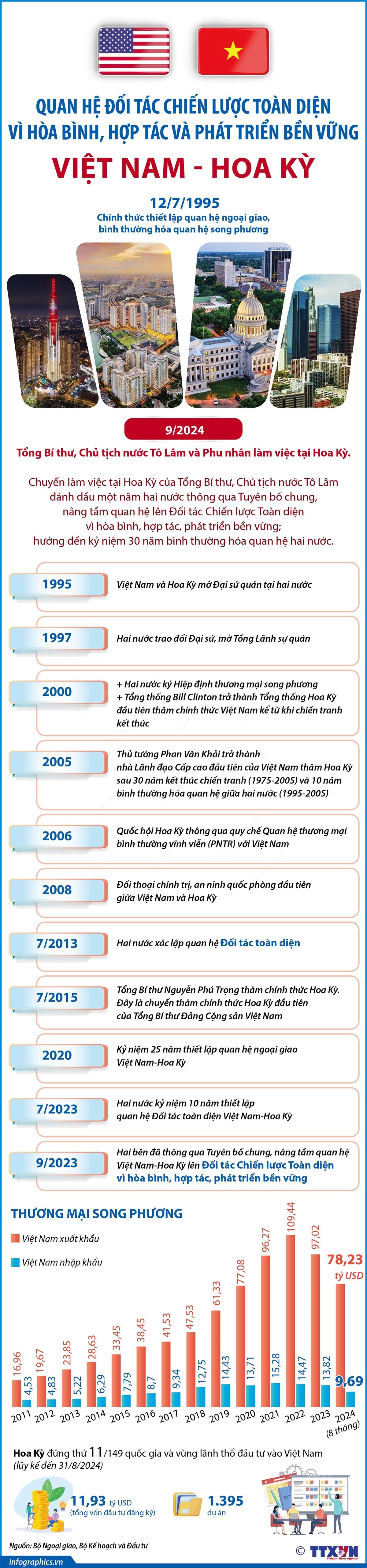 Hiện nay, Hoa Kỳ đã trở thành một trong những đối tác thương mại lớn nhất của Việt Nam và là thị trường xuất khẩu đầu tiên của Việt Nam vượt mốc kim ngạch 100 tỷ USD. Từ năm 1995 đến năm 2023, kim ngạch thương mại hai chiều giữa hai nước đã tăng trưởng ấn tượng, gấp hơn 140 lần - từ 451 triệu USD lên gần 140 tỷ USD.