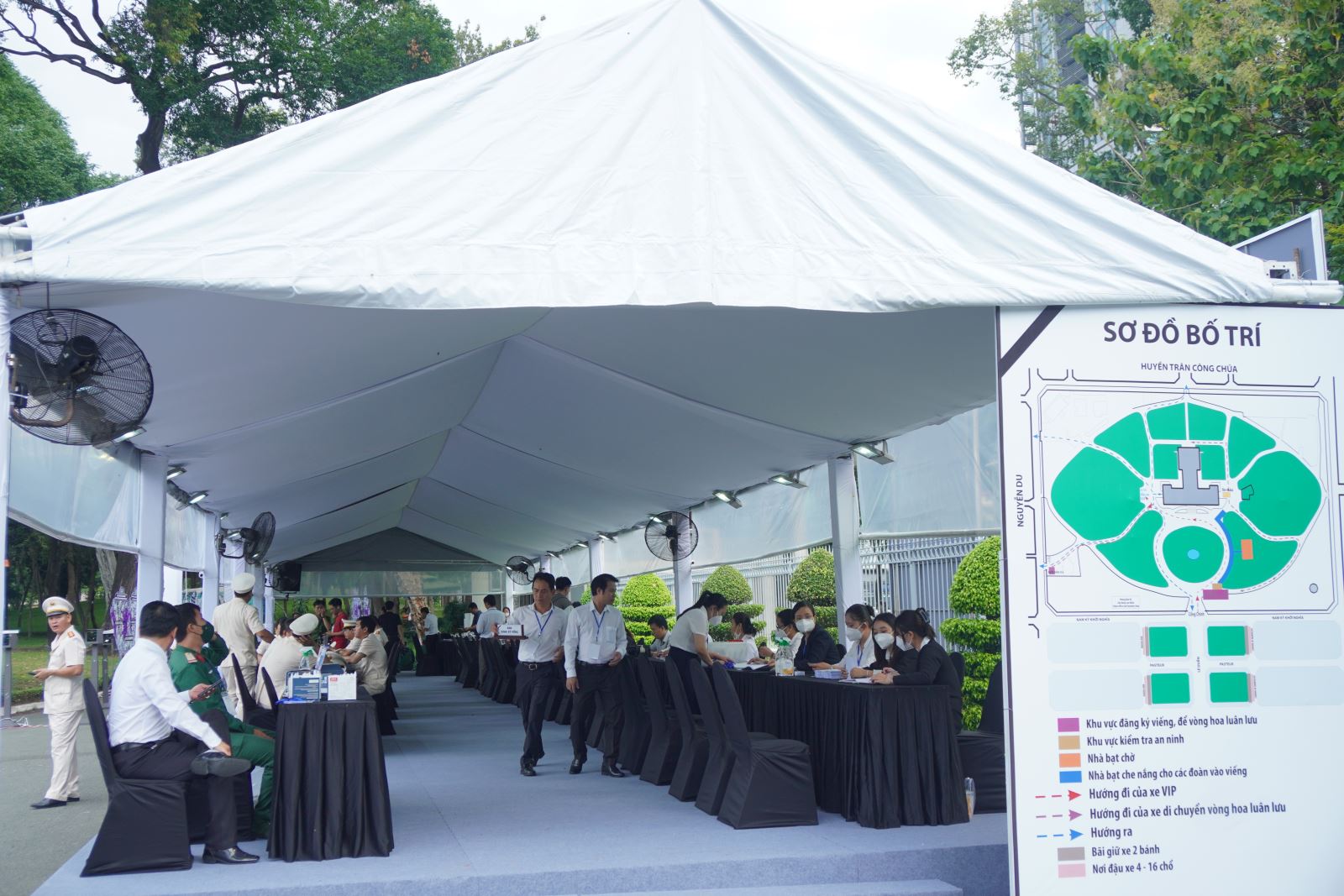 Khu vực phục vụ tang lễ đặt tại khu vực khuôn viên Hội trường Thống Nhất (24/5/2025). Ảnh: TTXVN