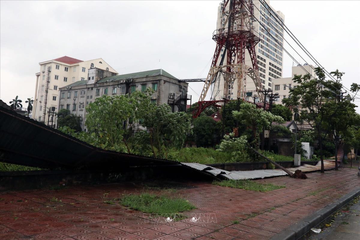 Do ảnh hưởng của gió bão, nhiều công trình, bờ rào, cây cối bị xô đổ (22/7/2025). Ảnh: Đại Nghĩa - TTXVN