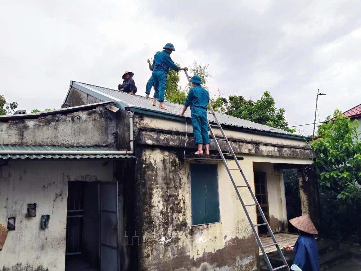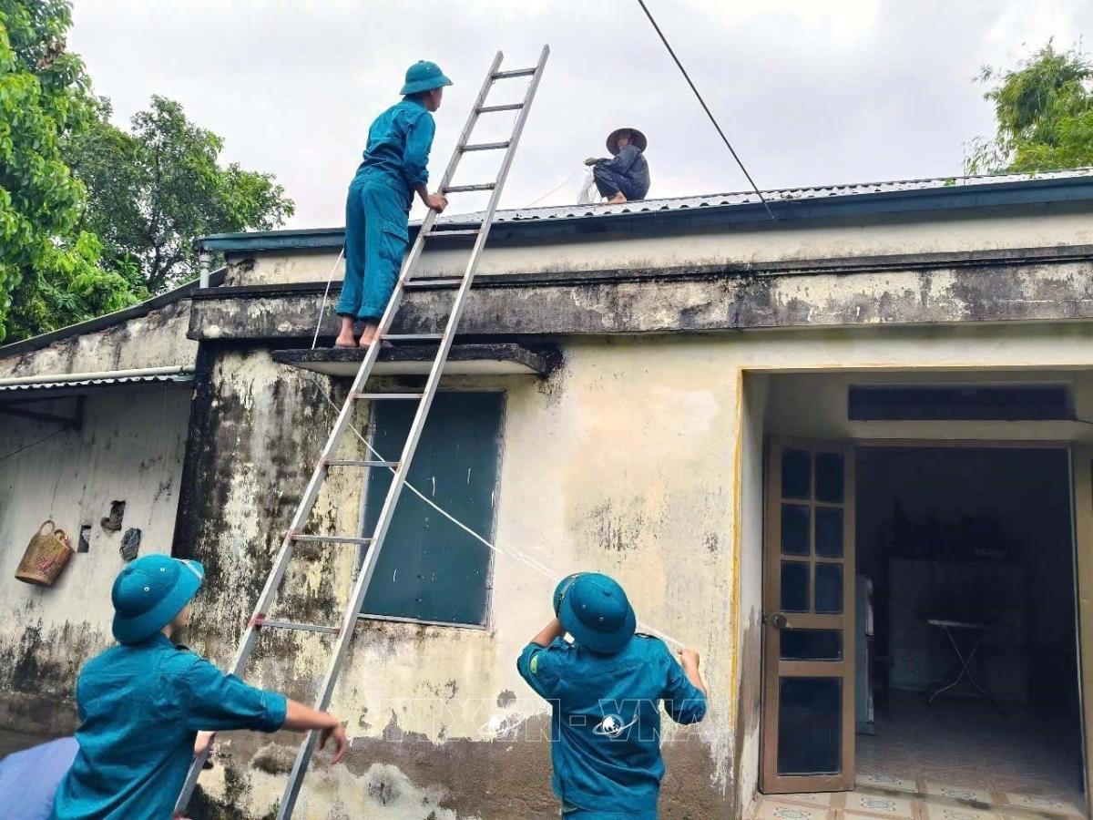Lực lượng dân quân các xã, phường trên địa bàn phòng thủ khu vực 1 - Phù Vân (Ninh Bình) giúp dân chằng, chống nhà cửa (22/7/2025). Ảnh: Đại Nghĩa - TTXVN