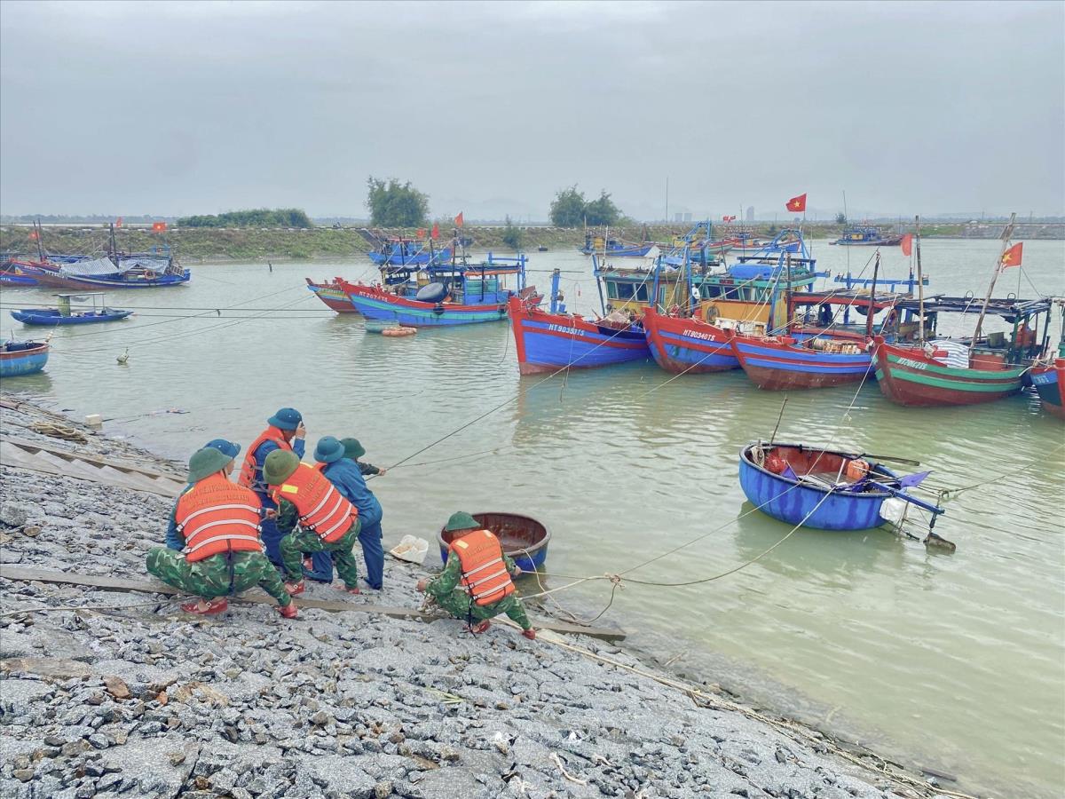 Lực lượng quân đội hỗ trợ người dân xã Đan Hải chằng néo lại tàu thuyền (21/7/2025). Ảnh: Hữu Quyết - TTXVN
