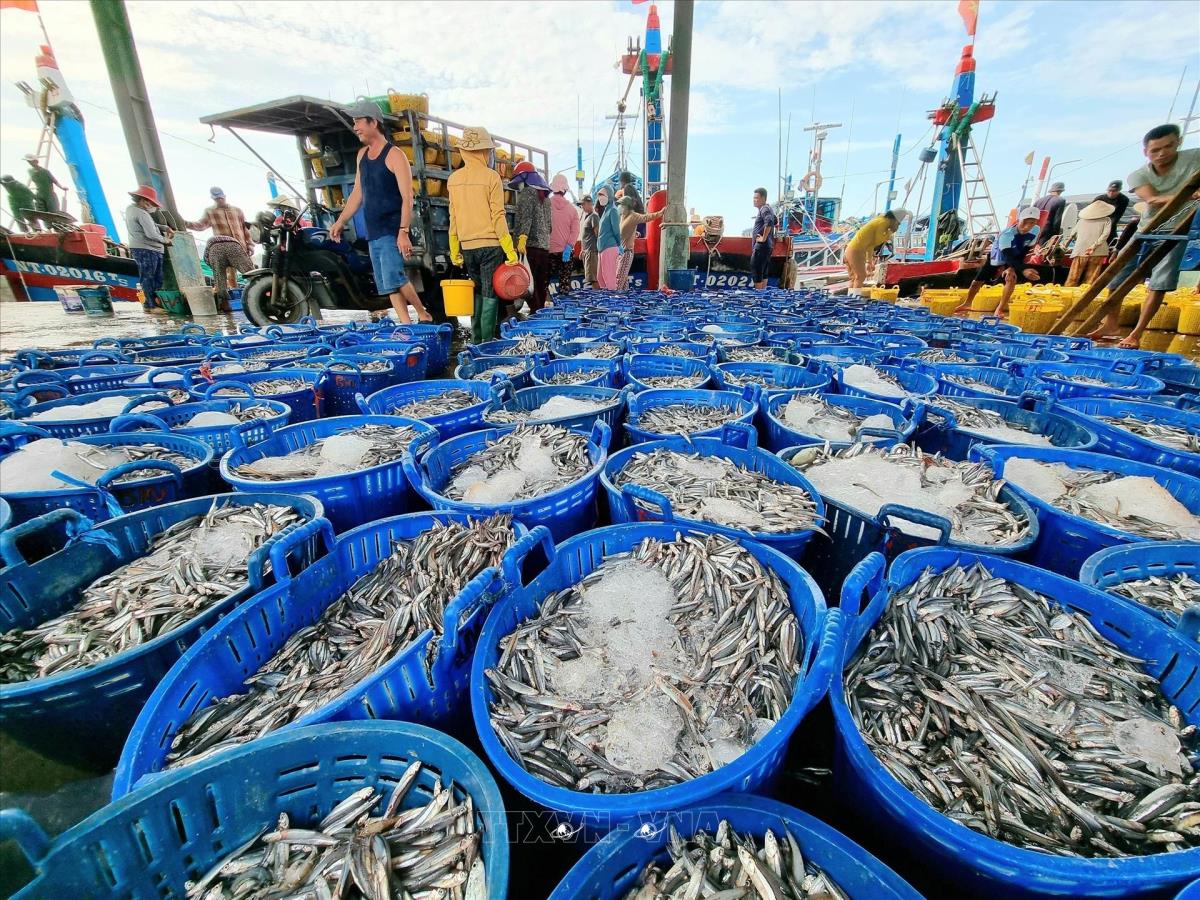 Hải sản sau khi đánh bắt được tập kết tại Cảng cá Cà Ná (xã Cà Ná, tỉnh Ninh Thuận) để đưa đi tiêu thụ. Ảnh: Nguyễn Thành – TTXVN
