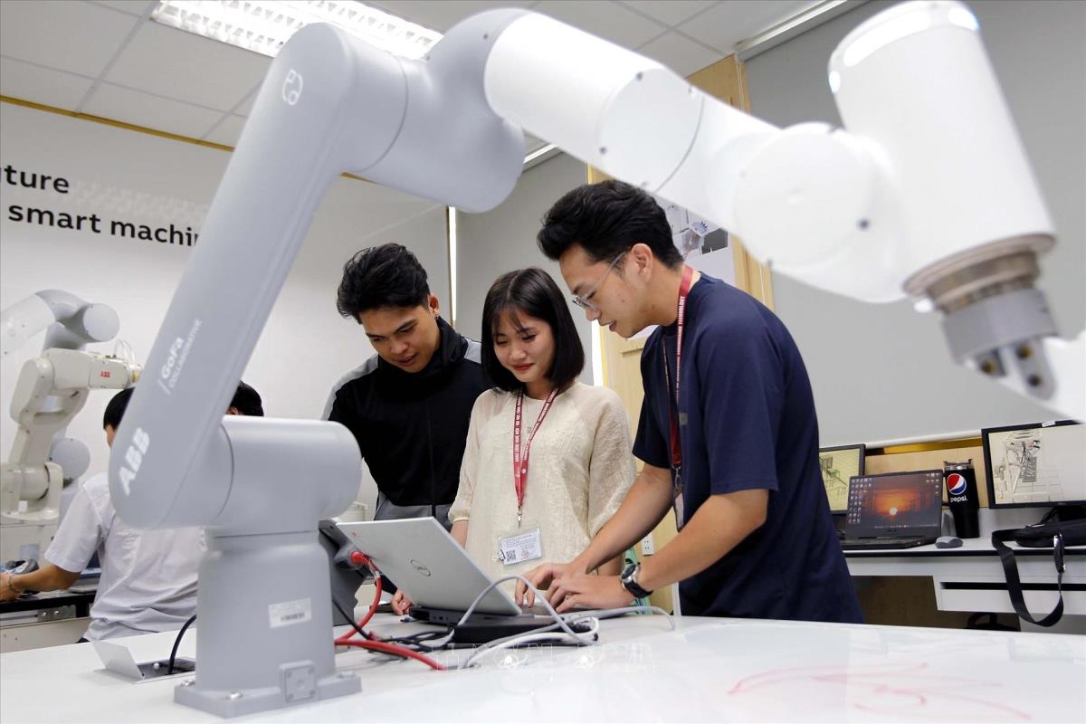 Sinh viên học tập, nghiên cứu tại phòng thí nghiệm Robotics, Trường Đại học Công nghiệp Thành phố Hồ Chí Minh. Ảnh: Thanh Vũ-TTXVN