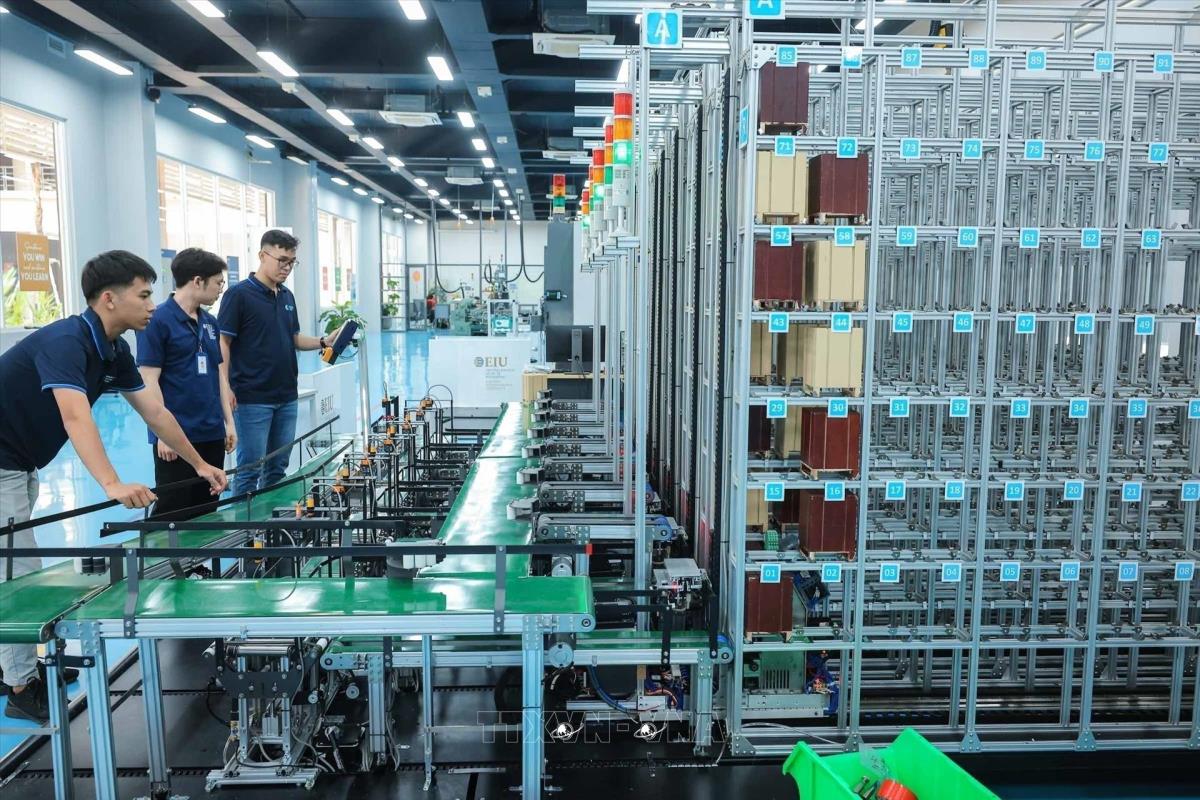 Trung tâm đổi mới sáng tạo Công nghiệp 4.0 - Trường Đại học Quốc tế Miền Đông (Bình Dương) góp phần đào tạo nguồn nhân lực chất lượng cao và ứng dụng công nghệ hiện đại, đẩy quá trình chuyển đổi số cho các doanh nghiệp tại địa phương. Ảnh: Hoàng Hiếu - TTXVN