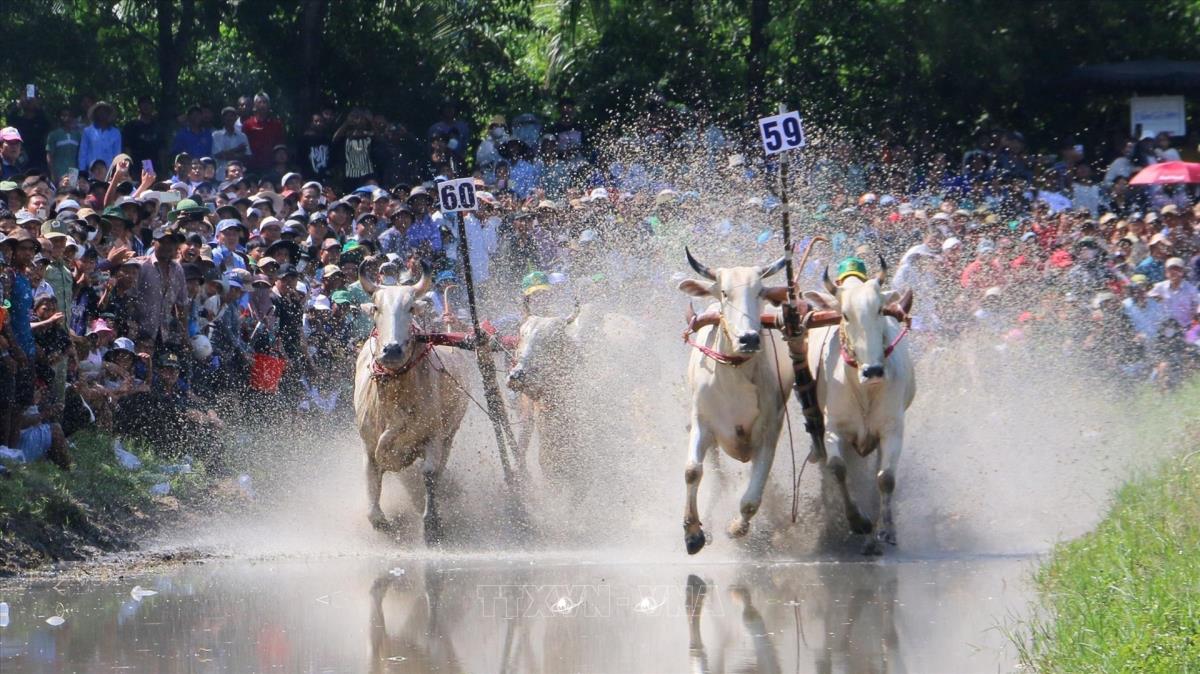 Hội đua bò Bảy Núi là lễ hội truyền thống hành năm của tỉnh An Giang nhân dịp Lễ Sene Dolta (lễ cúng ông bà) của đồng bào dân tộc Khmer Nam Bộ. Ảnh: Công Mạo - TTXVN