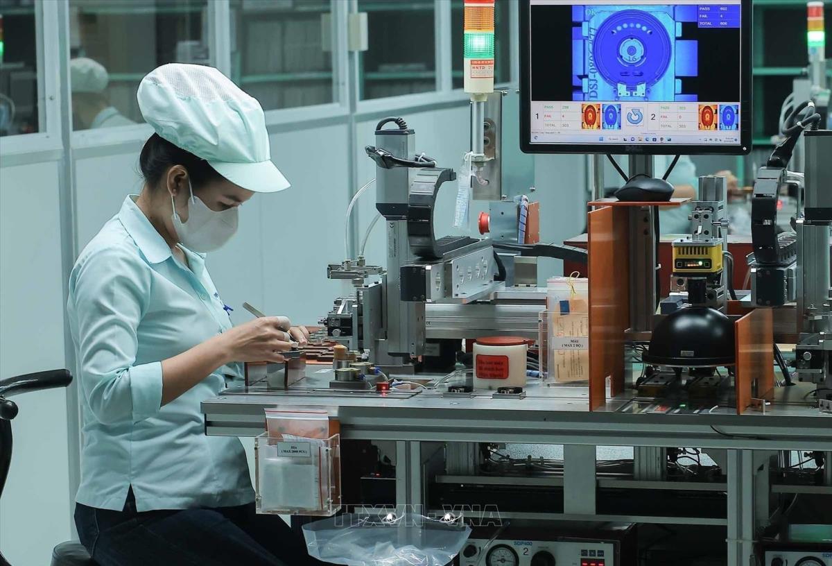 Sản xuất linh kiện điện tử tại Công ty TNHH Điện tử Foster Việt Nam (100% vốn Nhật Bản) trên địa bàn tỉnh Bình Dương. Ảnh: Hoàng Hiếu - TTXVN