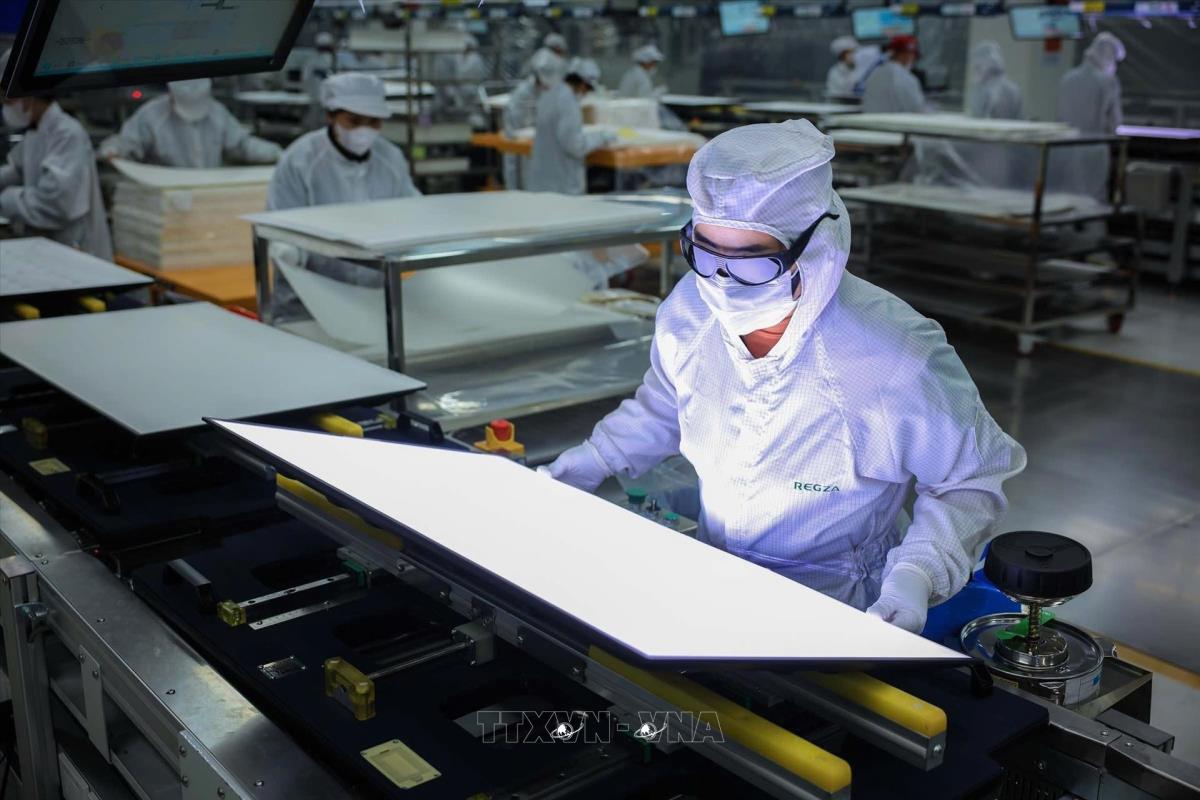 Công nhân sản xuất tivi màn hình lớn tại Công ty TNHH điện tử Regza Việt Nam đóng tại KCN Long Thành, tỉnh Đồng Nai. Ảnh: Hoàng Hiếu - TTXVN