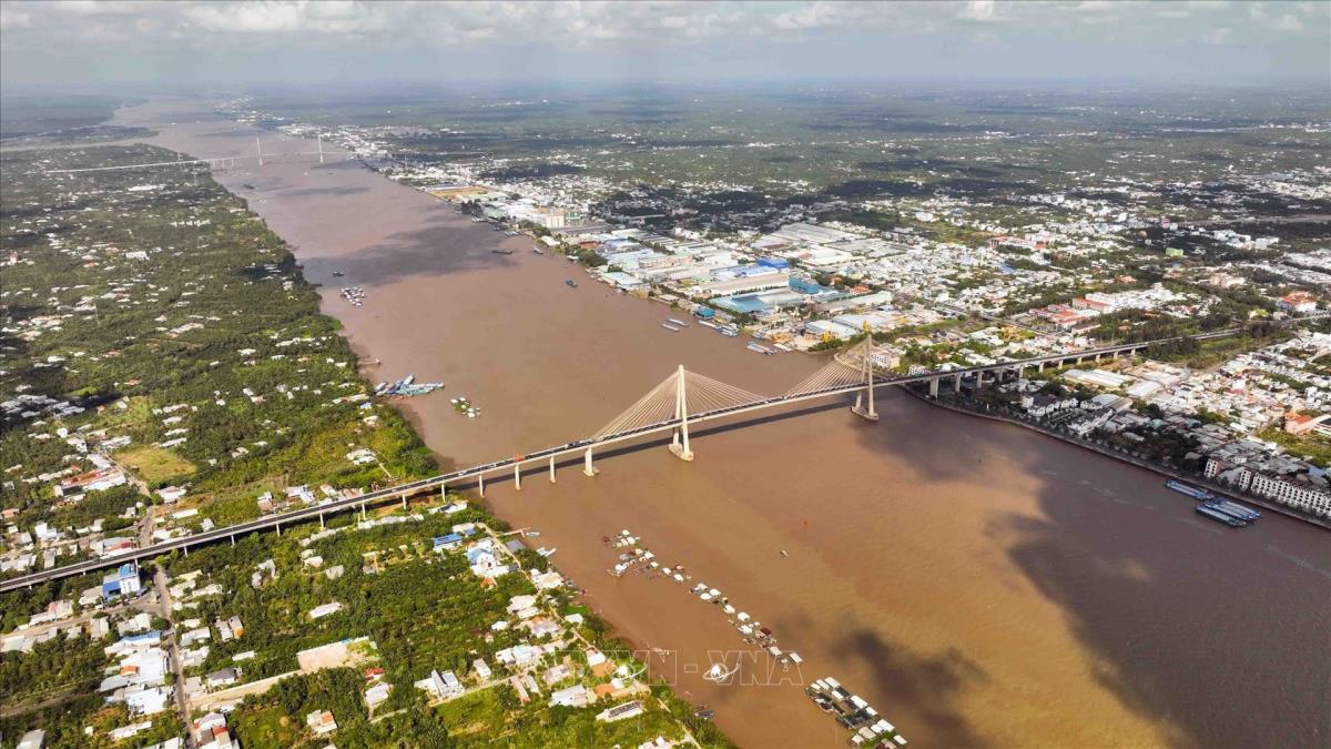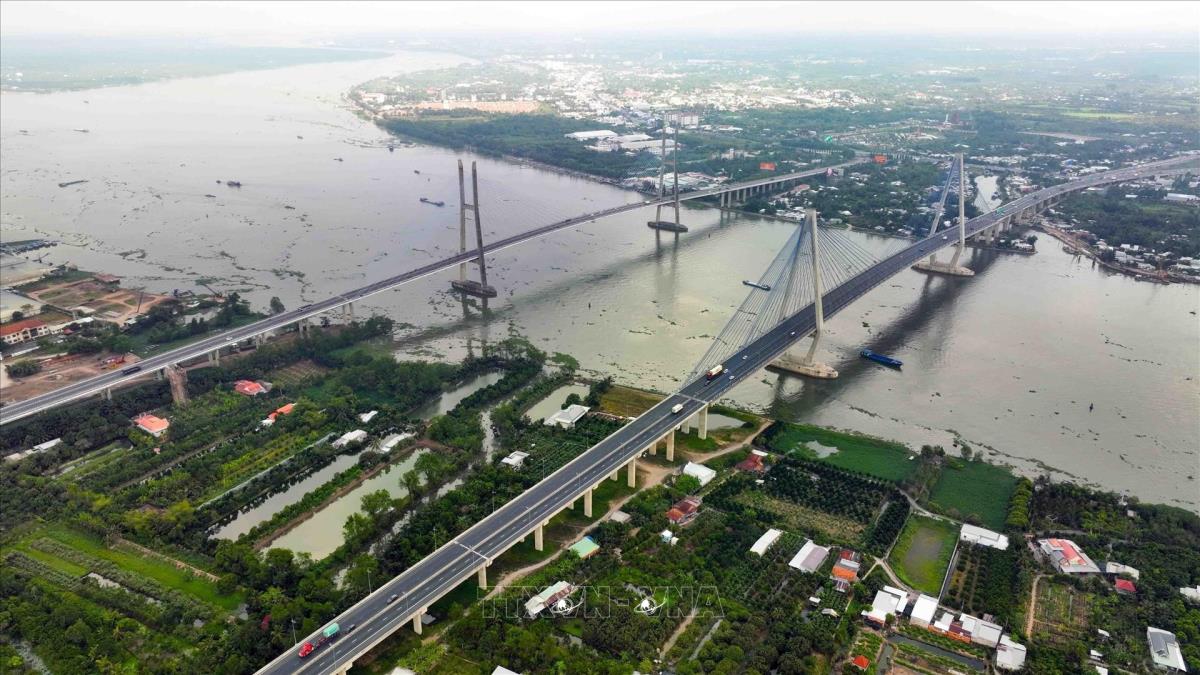 Cầu Mỹ Thuận 1 và cầu Mỹ Thuận 2 là cây cầu dây văng bắc qua sông Tiền, nối liền hai tỉnh Tiền Giang và Vĩnh Long, nằm cách Thành phố Hồ Chí Minh 125 km về hướng Tây Nam, trên Quốc lộ 1, đây là trục giao thông chính của vùng đồng bằng sông Cửu Long. Ảnh: Vũ Sinh - TTXVN