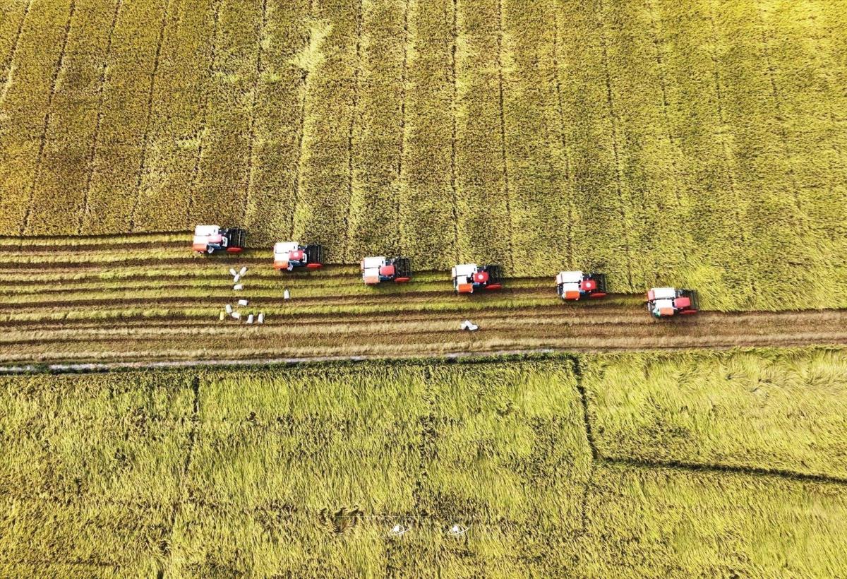 Công ty Cổ phần Tập đoàn Lộc Trời thu hoạch lúa trên cánh đồng liên kết phục vụ xuất khẩu ở huyện Thoại Sơn, tỉnh An Giang. Ảnh: Công Mạo-TTXVN