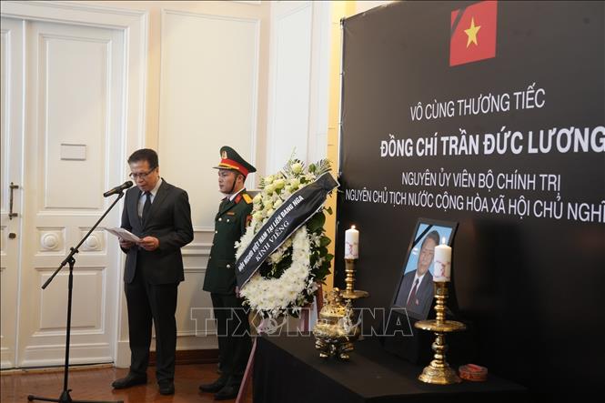 Hà Nội (TTXVN 24/5/2025) Sáng 24/5 theo giờ địa phương, Đại sứ quán Việt Nam tại LB Nga đã mở sổ tang và bắt đầu lễ viếng nguyên Ủy viên Bộ Chính trị, nguyên Chủ tịch nước Cộng hòa xã hội chủ nghĩa Việt Nam Trần Đức Lương. Tại phòng khách chính trụ sở Đại sứ quán trang trọng dòng chữ “Vô cùng thương tiếc đồng chí Trần Đức Lương, nguyên Ủy viên Bộ Chính trị, nguyên Chủ tịch nước Cộng hòa xã hội chủ nghĩa Việt Nam”, hai bên là vòng hoa trắng của Đảng ủy Đại sứ quán và Liên hiệp các Hội người Việt Nam tại LB Nga.