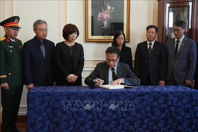 Đại sứ Việt Nam tại LB Nga Đặng Minh Khôi và ban lãnh đạo ĐSQ Việt Nam tại LB Nga ghi sổ tang tưởng nhớ nguyên Chủ tịch nước Trần Đức Lương (24/5/2025).