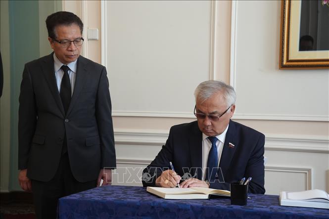 Phó Chủ nhiệm Uỷ ban về các vấn đề quốc tế, Hội đồng Liên bang (Thượng viện) LB Nga Bair Zamsuev ghi sổ tang chia buồn tại lễ viếng nguyên Chủ tịch nước Trần Đức Lương (24/5/2025).
