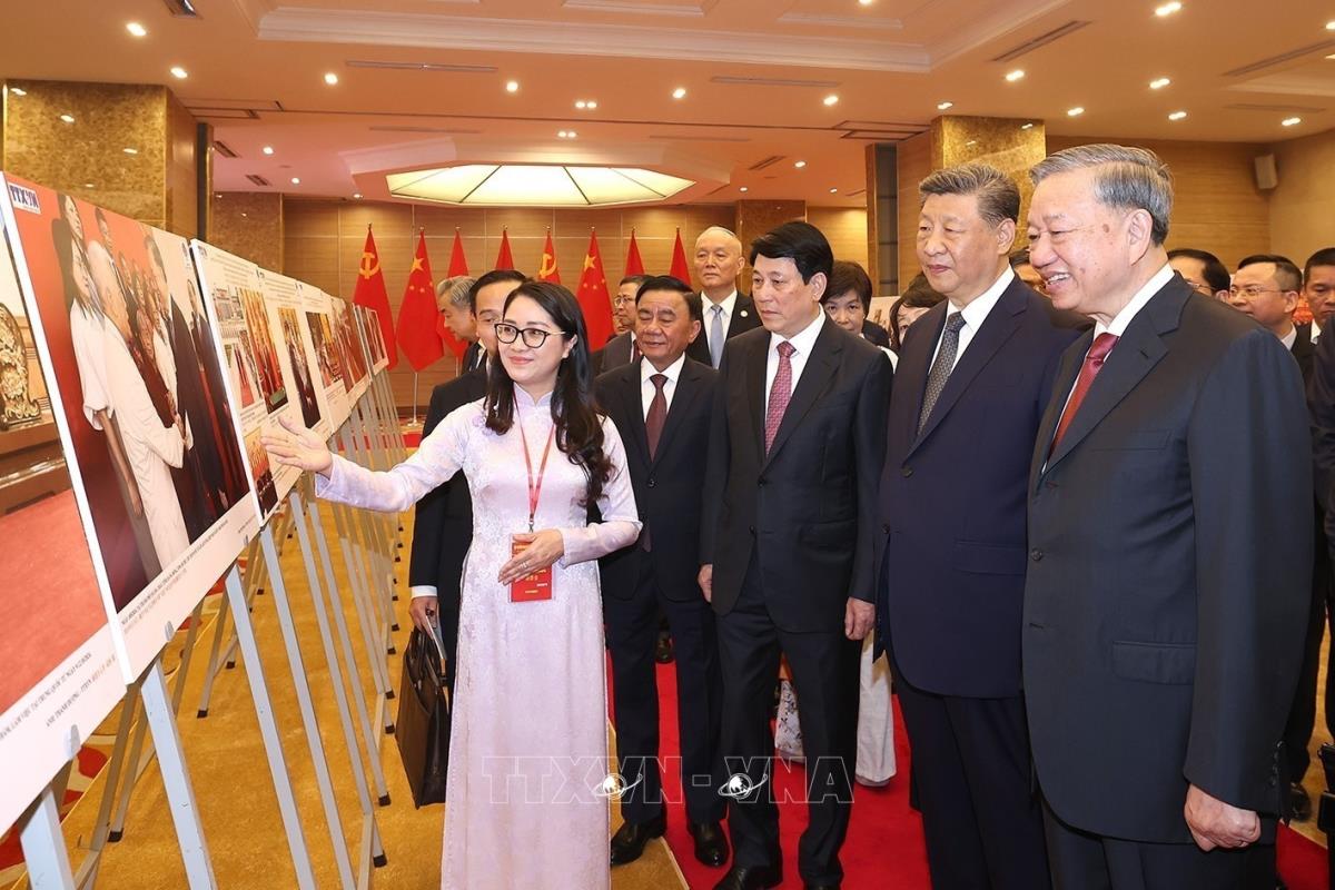 Tổng Bí thư Tô Lâm và Chủ tịch nước Lương Cường cùng Tổng Bí thư, Chủ tịch nước Trung Quốc Tập Cận Bình đã xem Trưng bày ảnh “75 năm thiết lập quan hệ ngoại giao Việt Nam - Trung Quốc”, do Thông tấn xã Việt Nam, Tân Hoa xã và Liên hiệp các tổ chức hữu nghị Việt Nam phối hợp thực hiện. Tổng Bí thư Tô Lâm trân trọng tặng Tổng Bí thư, Chủ tịch nước Trung Quốc Tập Cận Bình cuốn sách ảnh của Thông tấn xã Việt Nam gồm những bức ảnh tiêu biểu, ấn tượng về 5 chuyến thăm Việt Nam của đồng chí Tập Cận Bình từ năm 2011 đến chuyến thăm lần này.