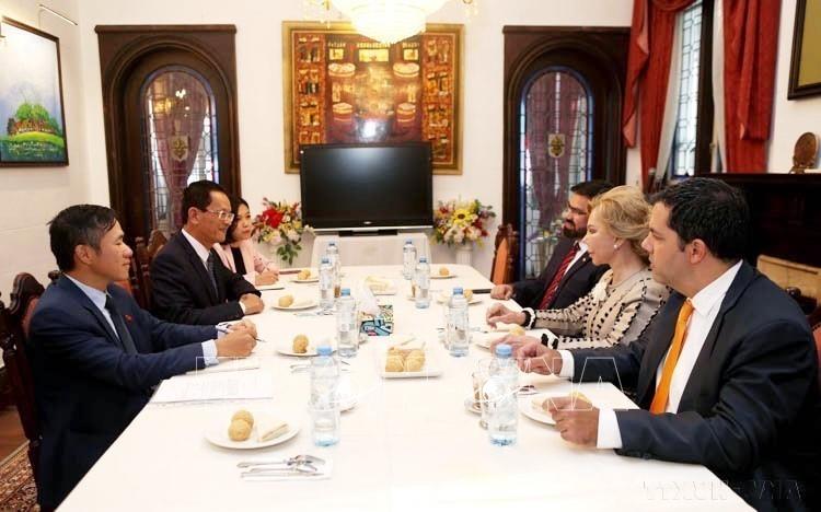 Đại sứ Việt Nam tại Argentina kiêm nhiệm tại Paraguay Dương Quốc Thanh làm việc với Bộ trưởng Văn hóa Paraguay Rubén Dario Capdevila và Lãnh sự danh dự Việt Nam tại Paraguay Maria del Carmen Falabella, nhằm thúc đẩy mối quan hệ hữu nghị, hợp tác và giao lưu văn hóa giữa hai nước (2022). Ảnh: Hoài Nam-TTXVN