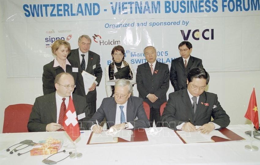 Trong chuyến thăm chính thức Thụy Sỹ tháng 3/2005, Chủ tịch Quốc hội Nguyễn Văn An chứng kiến lễ ký thỏa thuận hợp tác giữa Phòng Thương mại và Công nghiệp Việt Nam (VCCI) với Chương trình Xúc tiến nhập khẩu Thụy Sỹ và Phòng Thương mại Đông Nam Á (Sea) (24/3/2005). Ảnh: Trí Dũng - TTXVN