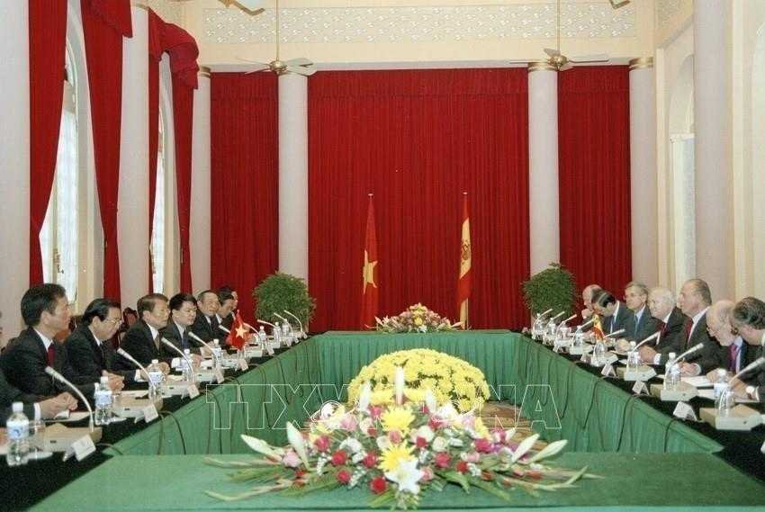 Chủ tịch nước Trần Đức Lương hội đàm với Nhà vua Tây Ban Nha Juan Carlos thăm cấp Nhà nước đến Việt Nam, ngày 20/2/2006, tại Phủ Chủ tịch. Ảnh: Nhan Sáng - TTXVN