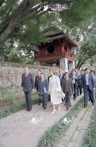 Ngày 20/2/2006, Nhà vua Tây Ban Nha Juan Carlos và Hoàng hậu Sofia thăm khu di tích Văn Miếu-Quốc Tử Giám (Hà Nội), nhân chuyến thăm cấp Nhà nước đến Việt Nam. Ảnh: Nhan Sáng - TTXVN