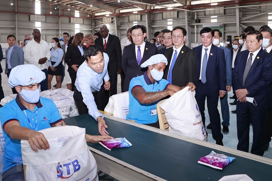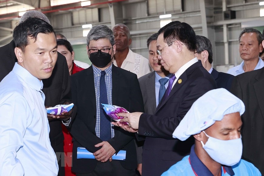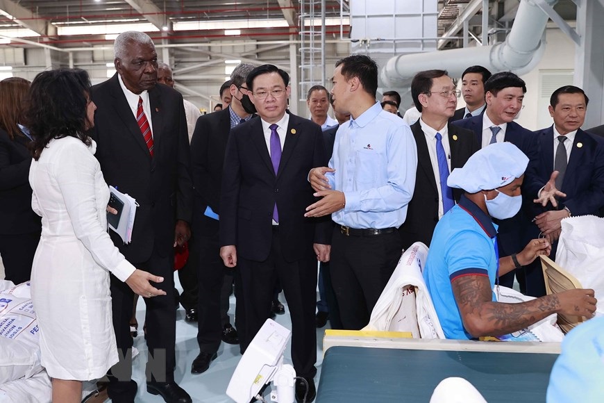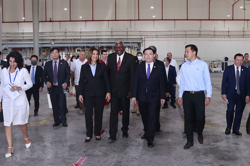 Hà Nội (TTXVN 22/4/2023) Chủ tịch Quốc hội Vương Đình Huệ và Chủ tịch Quốc hội Cuba Esteban Lazo Hernandez cắt băng khánh thành nhà máy bột giặt Suchel - TBV, dự Lễ khởi công giai đoạn 2, KCN Vimariel của công ty Viglacera...