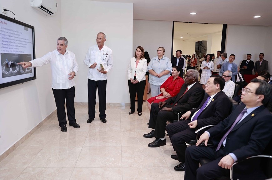 Chủ tịch Quốc hội Vương Đình Huệ nghe giới thiệu về trung tâm công nghệ sinh học và di truyền Cuba. (Ảnh: Doãn Tấn/TTXVN)