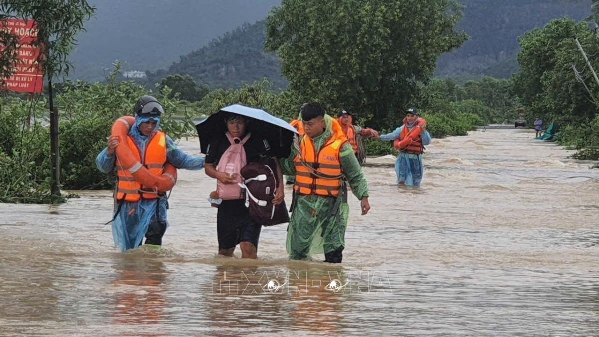 Lực lượng chức năng hỗ trợ sơ tán người dân khu vực phường Nam Nha Trang (Khánh Hòa) đến nơi an toàn (19/11/2025). Ảnh: TTXVN phát