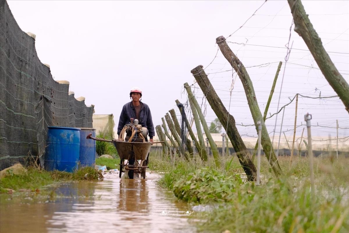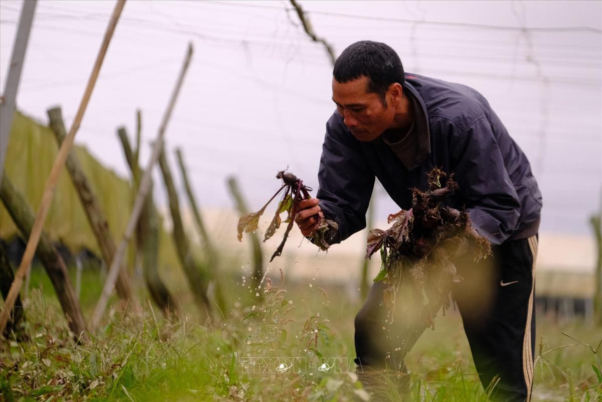 Người dân tranh thủ dọn rác do nước lũ cuốn về để tránh thiệt hại cho nhà lưới trồng rau màu ở Lâm Đồng. Ảnh: Nguyễn Dũng – TTXVN