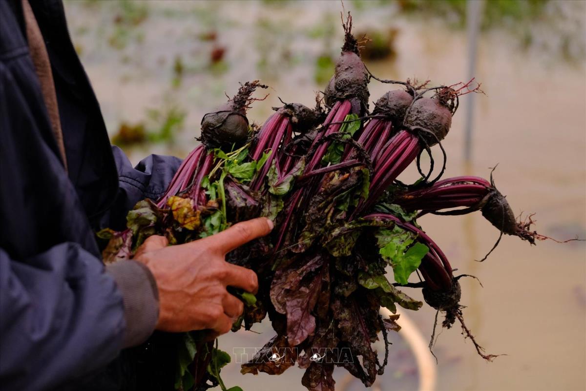 Ông Nguyễn Văn Thạch (xã Ka Đô, Lâm Đồng) bị thiệt hại khoảng 100 triệu đồng do toàn bộ vườn củ dền 7.000 m2 sắp thu hoạch bị ngập trong nước lũ. Ảnh: Nguyễn Dũng – TTXVN