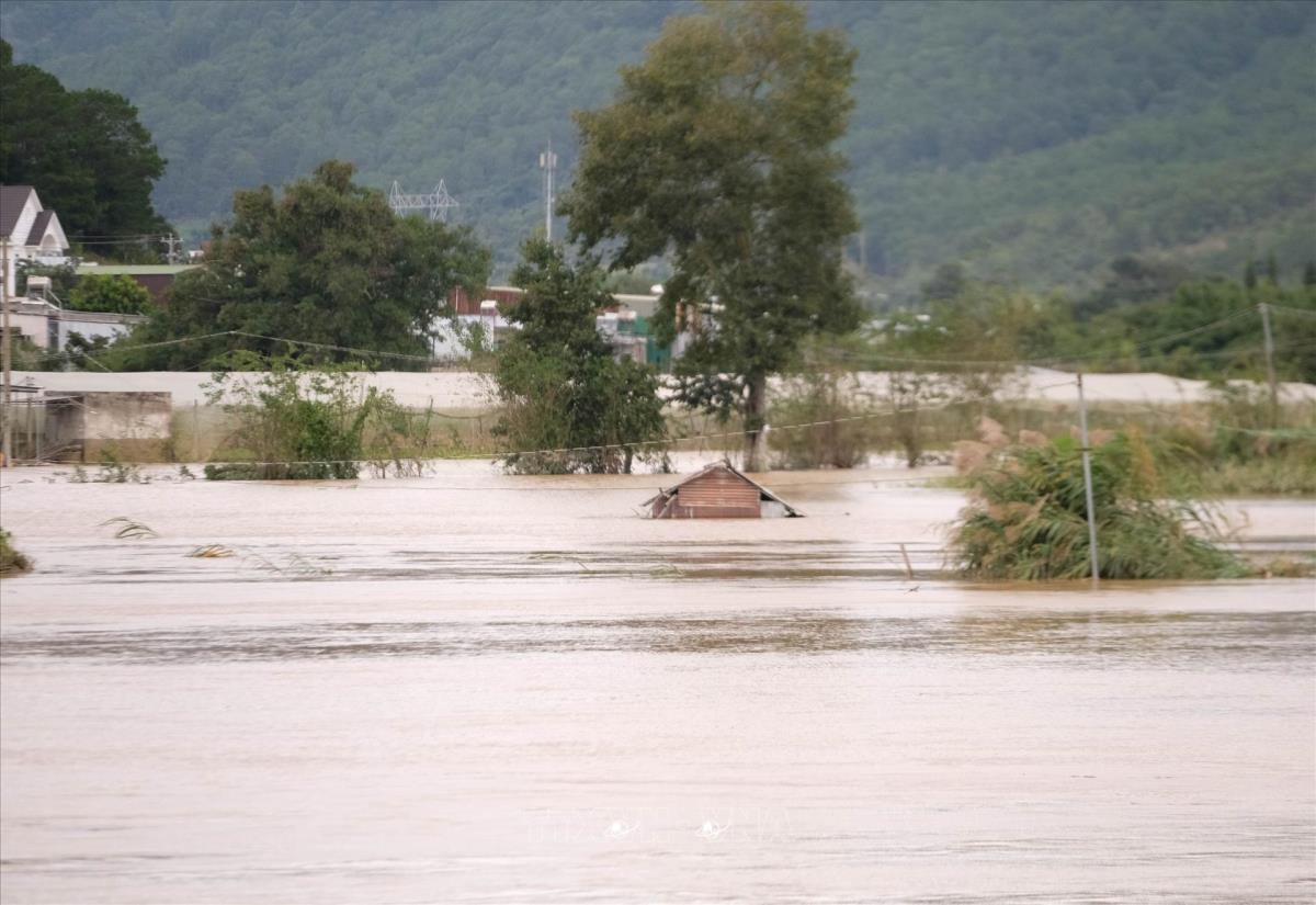 Nước lũ dâng cao gây ngập hai bên sông Đa Nhim (đoạn qua xã Ka Đô, Lâm Đồng), sau khi Công ty Cổ phần thủy điện Đa Nhim – Hàm Thuận – Đa Mi xả lũ từ sáng 17/11/2025. Ảnh: Nguyễn Dũng – TTXVN
