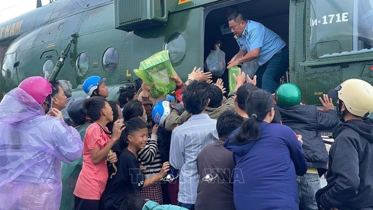 Người dân xã Phong Liên 1 và Phong Liên 2, Đăk Lắk nhận hàng cứu trợ từ trực thăng của Trung đoàn Không quân 917. Ảnh: TTXVN phát
