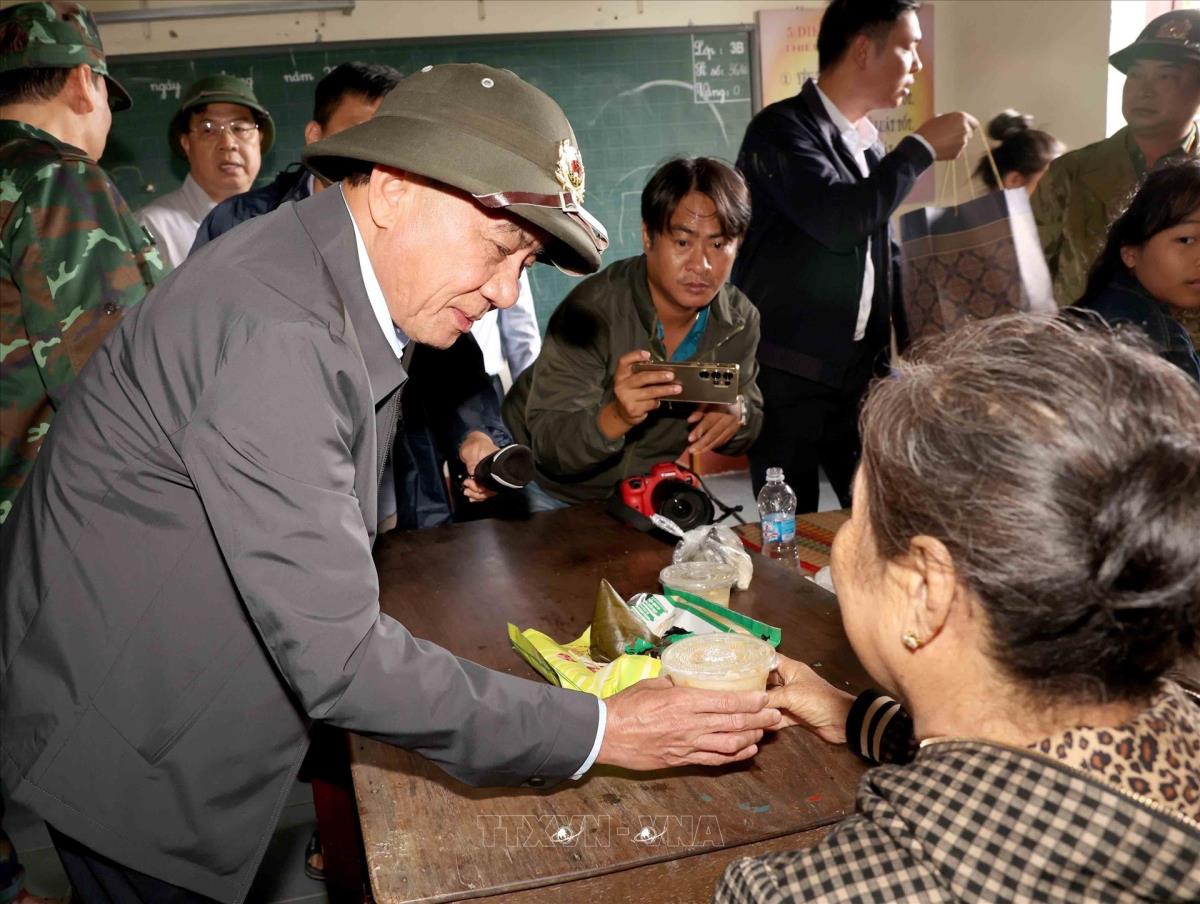 Phó Thủ tướng Thường trực Nguyễn Hòa Bình thăm hỏi người dân vùng lũ. Ảnh: Tuấn Anh - TTXVN