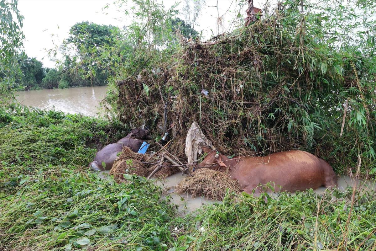 Xác những con bò bị chết do nước lũ. Ảnh: Đỗ Trưởng - TTXVN