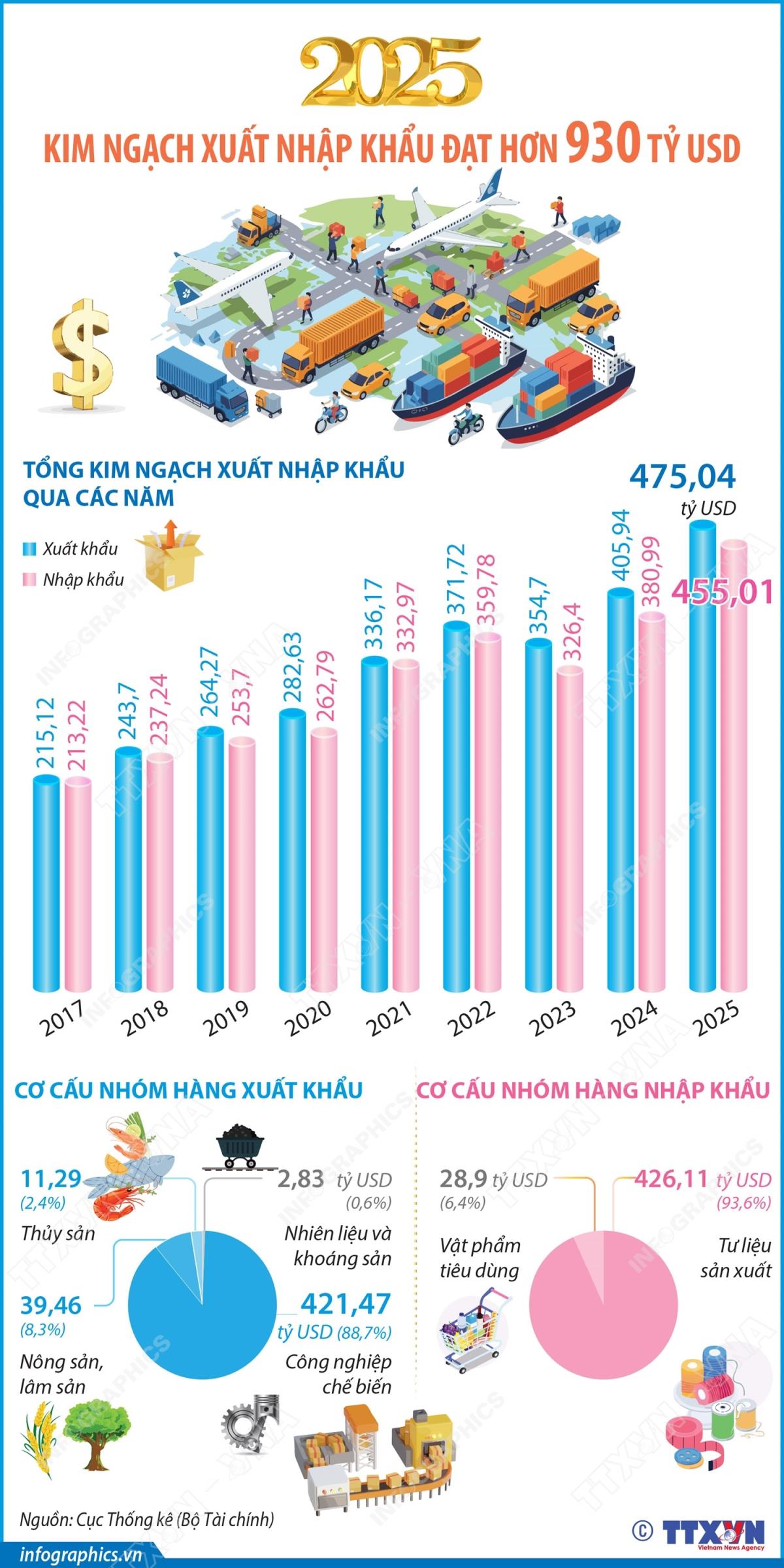 [Infographics] Năm 2025: Kim ngạch xuất nhập khẩu đạt hơn 930 tỷ USD